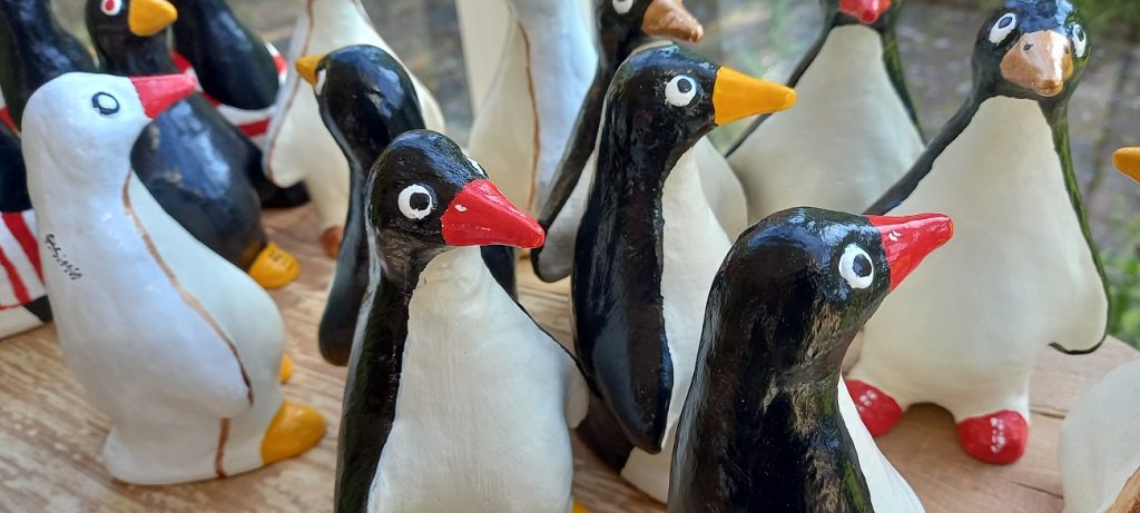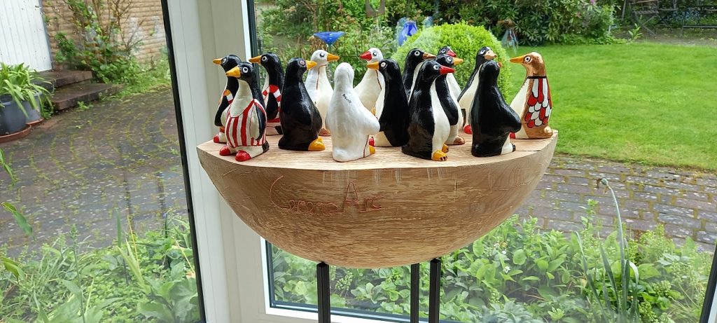 Ende April, im 2. CORONA-Jahr 2021 bewaffnete ich mich mit meiner Kettensäge und schnitt aus dem Birkenstamm einen Bootskörper, die Corona-Arche. Aufgesetzt auf einen schweren eisernen Blumenständer machte der Schiffsrumpf einen soliden Eindruck. Jetzt musste nur noch die Besatzung an Bord gehen. Die Besatzung sollte aber aus neuen Leuten bestehen und ich erinnerte mich an die Zeit in Linne und die damalige Pinguin-Manufaktur.