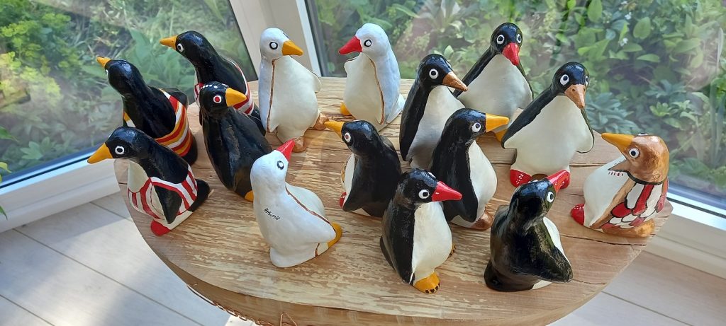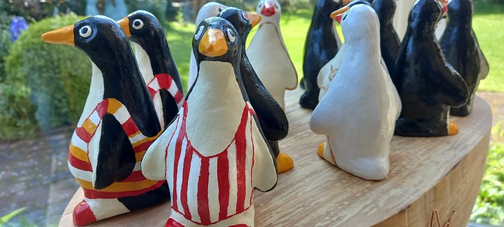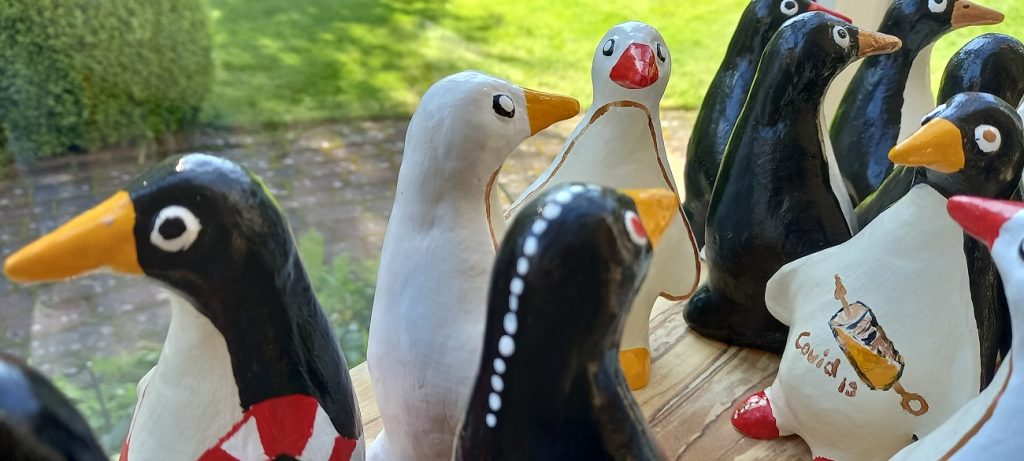 Die dann folgende Bemalung der Figuren war abgestimmt auf den Einsatzzweck an Deck der Corona-Arche. Es gibt ein Souverän, der fünf Pinguinen die Beschränkungen infolge der Coronaregeln erklärt. Einer der zuhörenden Pinguine wird abgelenkt durch drei infizierte bzw. genesene Corona-Patienten. Diese sind ziemlich farblos und haben diverse Blessuren. Sie haben Impfpersonal an ihrer Seite, schauen aber auch realitätsnah dem Tod ins Auge. Am Bug der Arche warten drei feierfreudige-Pinguine in Badekleidung. Sie sind schon wieder auf Kreuzfahrt und fiebern ihrem Urlaub oder der EM entgegen. Ob sie infiziert, getestet oder geimpft sind, wer kann das schon mit Sicherheit beantworten.