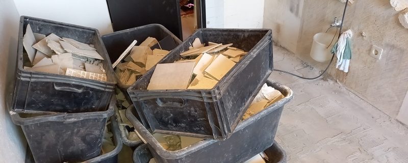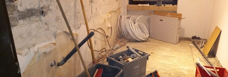 Die abgetragenen Fliesen, der Estrich und Mauerschutt sind von den fleißigen Handwerkern per Hand durch das Treppenhaus und sicher auch per Fahrstuhl in die an der Straße stehende Mulde verfrachtet worden. Was das betrifft, sieht es schon etwas aufgeräumter aus, in Küche, Bad und WC.  Wie bei jeder Altbausanierung tauchen auch sofort die ersten Problemfälle …