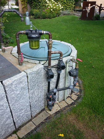 Die beiden Bewässerungsstränge für den Rasen wurden kurzerhand an die Pumpe bei der Regentonne an die vorhandenen Armaturen angeschlossen. Diese mussten etwas modifiziert werden, weil noch ein Wasserfilter und drei elektrische Ventile dazu kamen. Zwei Ventile für die Bewässerungsstränge und eines für die Zuführung von Gartenwasser in die Zisterne. 1000 Liter Regenwasser, also 1 Kubikmeter sind nach 10 Minuten Bewässerung mit dem ersten Strang bereits verbraucht, so dass wir bei längerer Trockenheit natürlich mit Gartenwasser arbeiten müssen. Parallel zur Bewässerung des Rasens läuft folglich immer Gartenwasser in die Zisterne nach. Die Steuerung (Gardena, ausgelegt für max. 4 Stränge und je Strang für 4 Intervalle) wurde nahe der Pumpe installiert, zusammen mit einem Pegelanzeiger für den Wasserstand in der Zisterne. So lässt sich immer überprüfen, ob die Zisterne in besonderen Situationen manuell nachgefüllt werden muss.