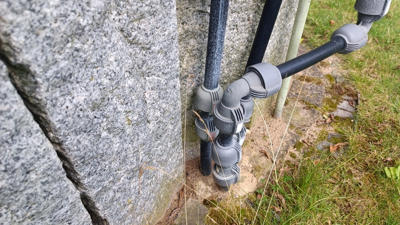 Im Jahr 2010 wurde das Micro Drip-System von Gardena erworben und alle Beete rund um das Haus mit entsprechenden Schläuchen und Sprühdüsen versehen. Die Wasseranschlüsse erfolgten an den vorhandenen 7 Zapfstellen, die wir mit kleinen Bewässerungscomputern ausstatteten. Darüber hinaus installierten wir 4 Regensensoren, die über in die Erde vergrabenen 2-adrigen Leitungen dafür sorgten, dass die Computer bei Regenwetter keine Bewässerung einleiteten. Die Computer sind auf die Nachtzeit zwischen 02:00 Uhr und 06:00 Uhr programmiert, so dass bei besonders trockenem Wetter (nur dann waren die Wasserhähne geöffnet) nachts und nacheinander in den 7 Segmenten etwa 30 Minuten bewässert wurde. Auf der Nordseite des Hauses genügte die Bewässerung alle 2 oder 3 Tage, weil die Sonne hier nicht so dominant ist.
